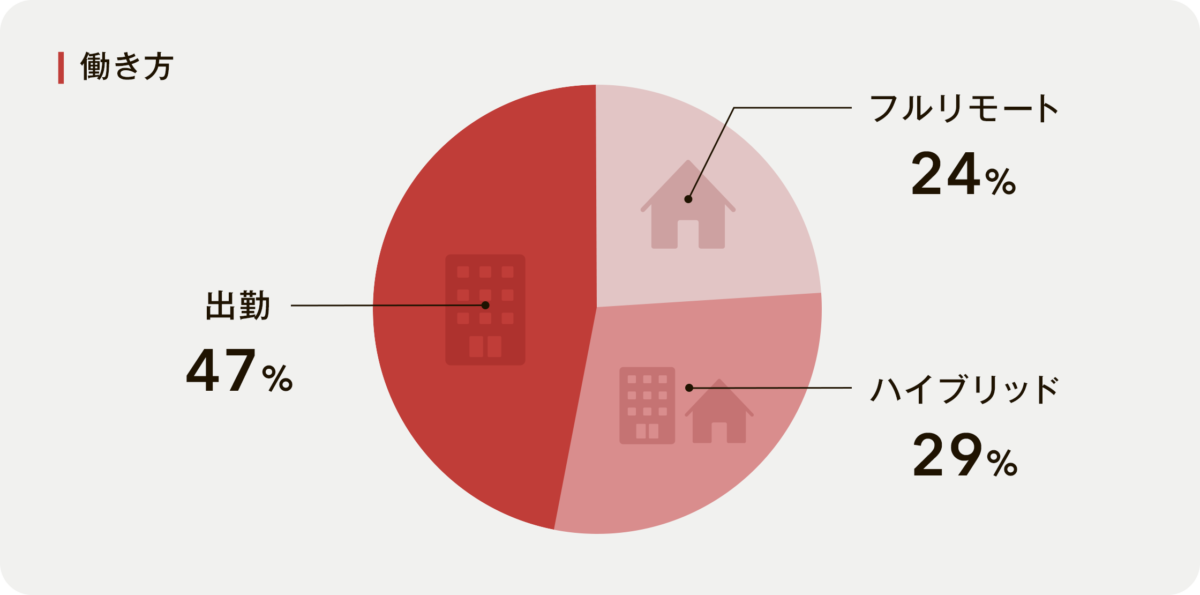 働き方は一律ではなく、業務や役割に合わせて柔軟に選ばれています。割合はフルリモート24%、ハイブリッド29%、出勤47%。対面での連携が必要な場面はしっかり集まりつつ、集中したい作業はリモートで進めるなど、パフォーマンスを最大化するスタイルです。
