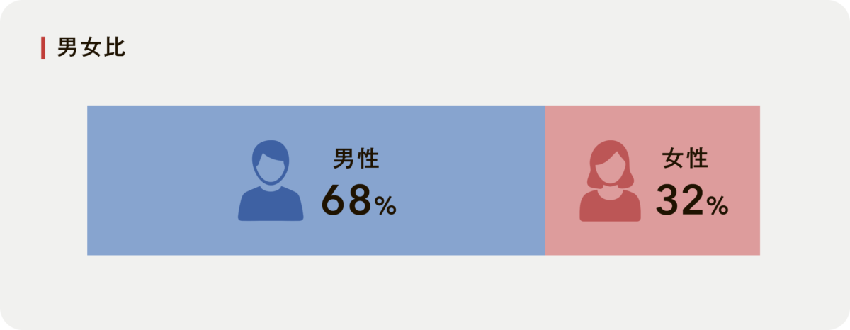 男女比は男性68%、女性32%。まだまだ女性活躍の伸びしろはありますが、多様なバックグラウンドのメンバーがそれぞれの専門性を活かして働いています。また、管理部門は女性が主幹となって部署運営を実施しており、多様な人材が活躍する風土が育っています。
