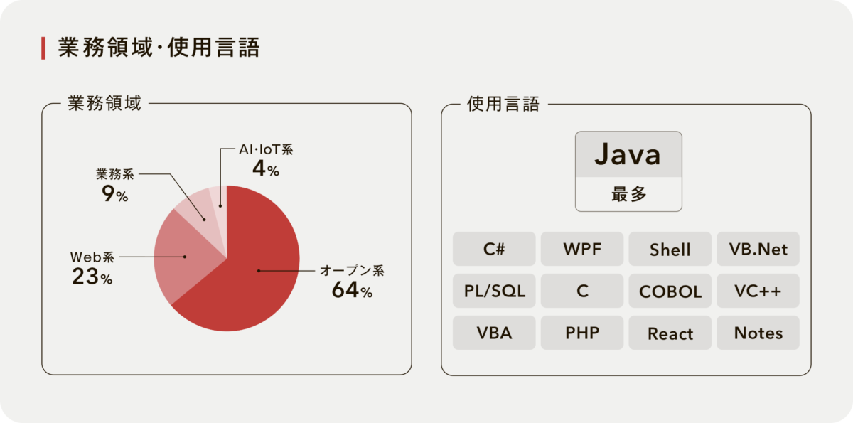 使用言語・技術は、Javaが最も多い一方で、C#、WPF、Shell、VB.Net、PL/SQL、C、COBOL、VC++、VBA、PHP、React、Notesなど幅広く扱っています。さらに、エンジニアリング以外にも人事コンサル/Webディレクション/Webデザインなど、専門分野で活躍するメンバーも在籍しています。