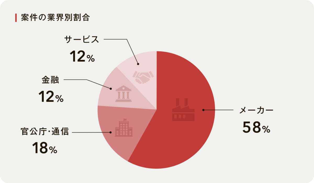 最も多いのは メーカー(58%)。次いで 官公庁・通信(18%)/金融(12%)/サービス(12%) となっています。メーカー領域はIoTやセキュリティなど「モノ×IT」のテーマが生まれやすく、先端領域の案件を取りにいきやすいマーケット。E-agentが戦略的に注力している背景が、数字にも表れています。
