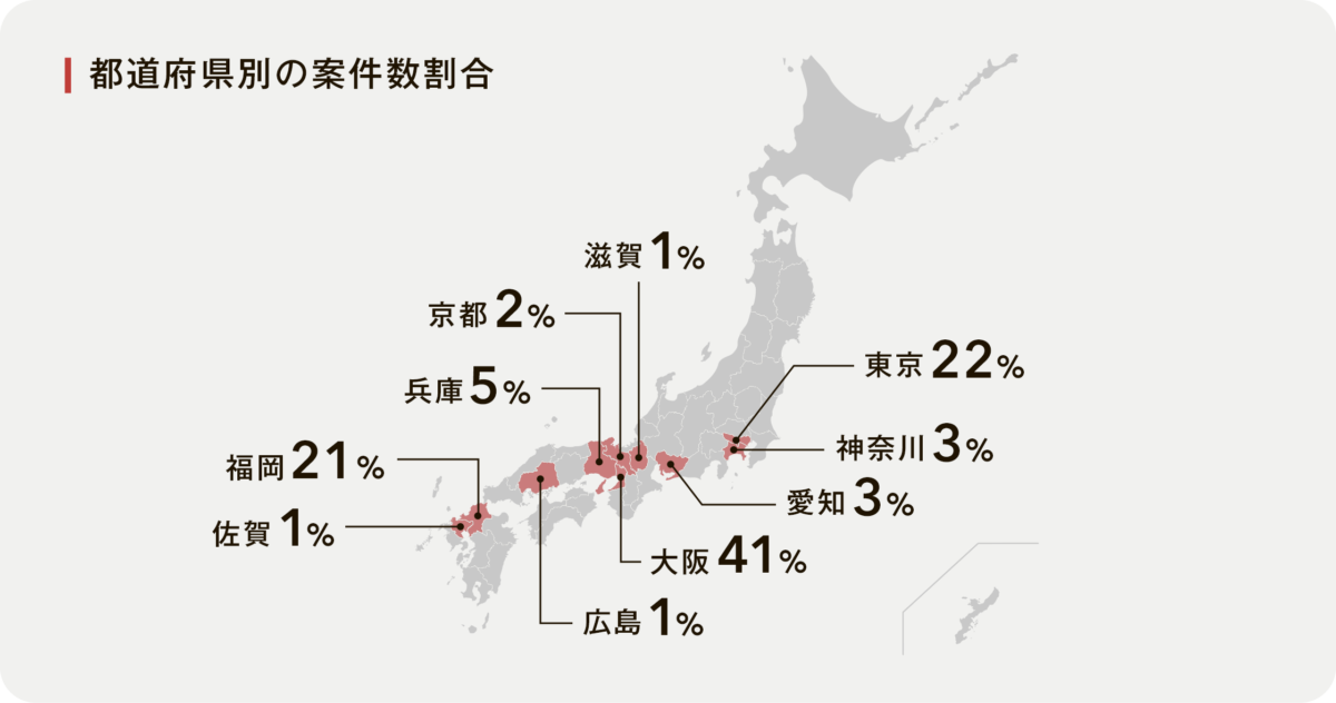 エリアは 大阪(41%) が最多で、東京(22%)/福岡(21%) が続きます。その他に兵庫(5%)/神奈川(3%)/愛知(3%)/京都(2%)/滋賀・佐賀・広島(各1%) と、複数拠点で案件を保有。都市部だけに偏らず、関西・関東・九州を中心に選択肢があるのが特徴です。