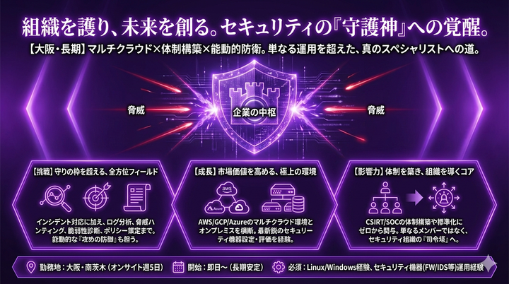 サービスやユーザーの安全を守る“最後の砦”となるポジション。単なる監視に留まらず、分析力や顧客対応力などの専門的なスキルを磨くことができます。また大手メーカーの重要拠点案件であるため安心して長く就業いただけるほか、フルリモート勤務の快適さも魅力のひとつです。